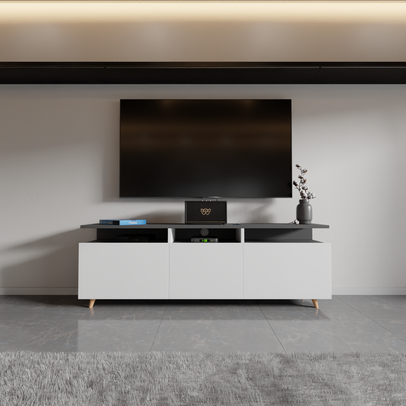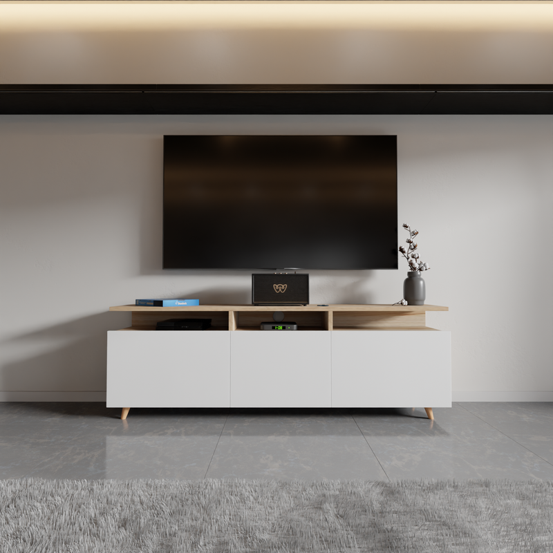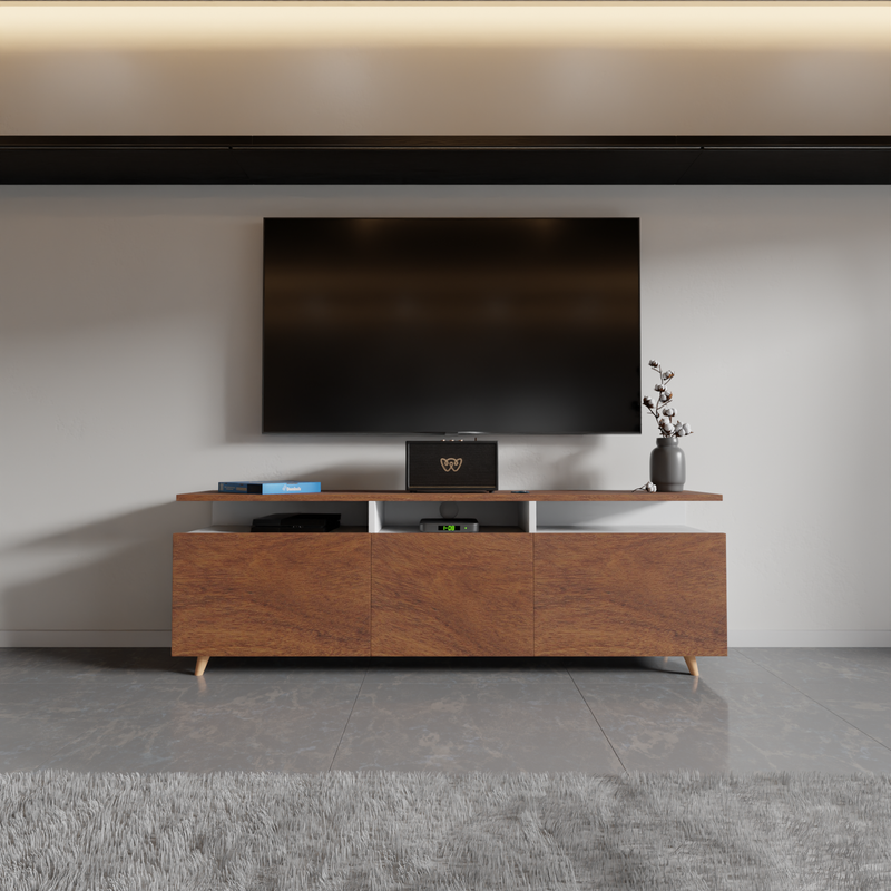 Bring timeless elegance and practical functionality to your living space with this Modern Mid-Century Low Profile TV Stand, designed to blend seamlessly with contemporary, minimalist, or Scandinavian interiors. Crafted with a sleek white body and accented with rich walnut wood finish drawer fronts, this entertainment center adds warmth and style to any room while providing versatile storage solutions for your multimedia and decor needs. Measuring perfectly to accommodate TVs up to 65 inches, this stand features a spacious tabletop for your television and decorative items, plus two smooth-glide sliding drawers that offer concealed storage for remotes, gaming accessories, manuals, or other living room essentials. The central open shelving unit includes two large compartments—perfect for gaming consoles, DVD players, streaming devices, or displaying your favorite media collections.