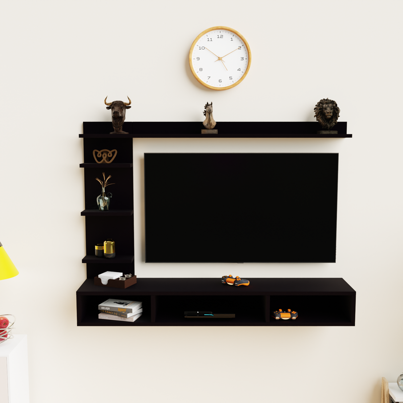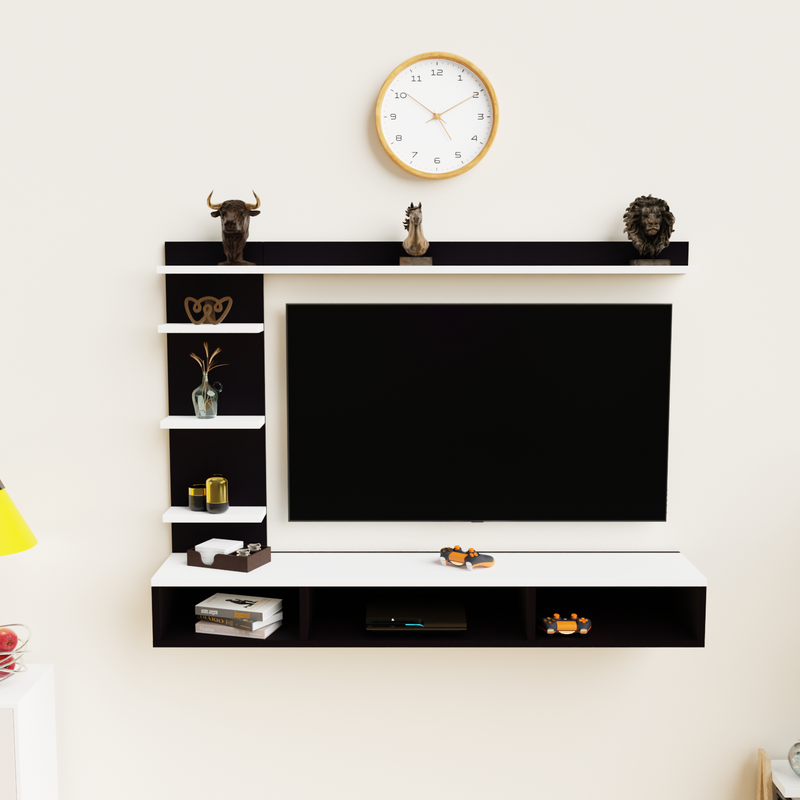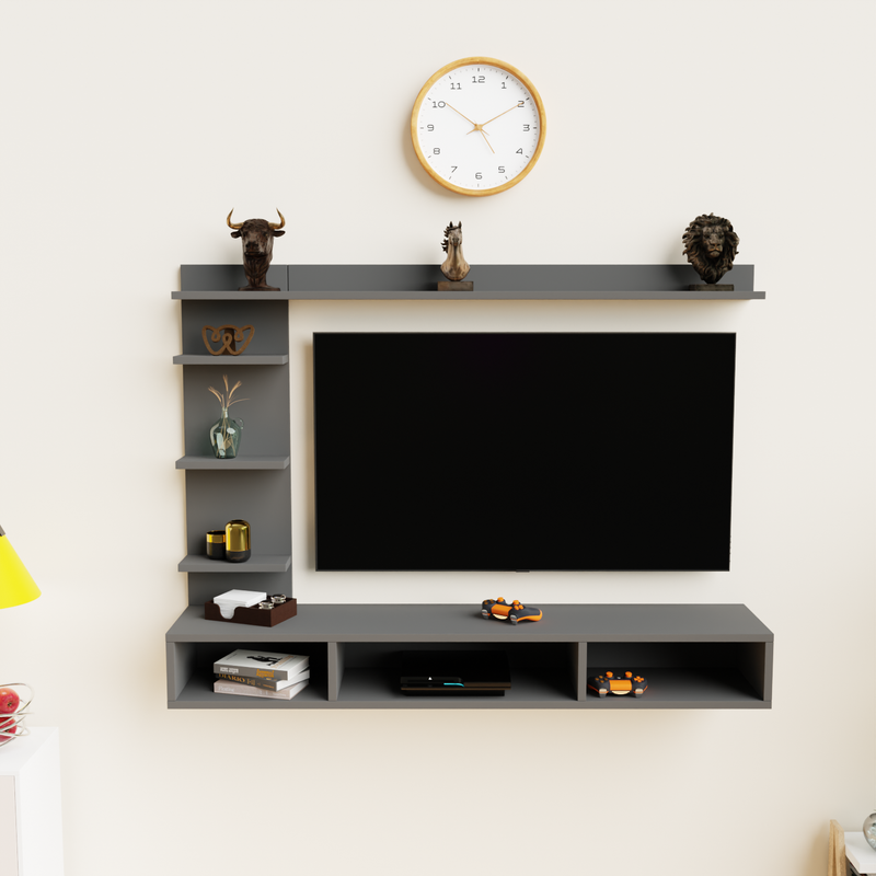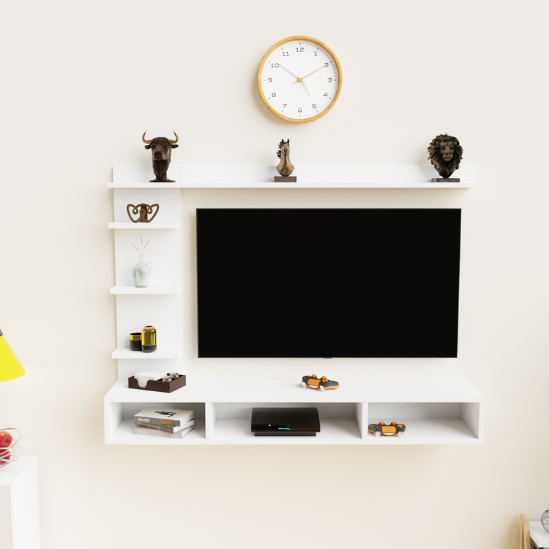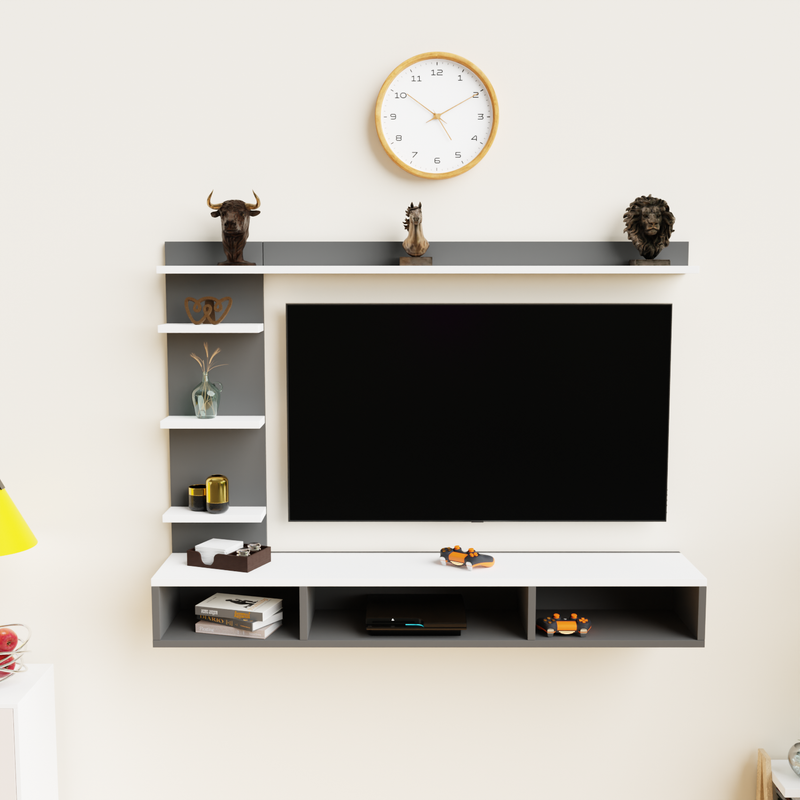 Transform your living space with this elegantly modern wall-mounted entertainment center, a sophisticated and space-saving solution designed to elevate your home media experience. Crafted with a sleek, matte finish, this entertainment unit effortlessly blends functionality with contemporary aesthetics, making it the perfect centerpiece for any modern living room, lounge, or entertainment area. At the heart of this unit is a spacious central panel that securely accommodates a large flat-screen TV, providing a bold focal point for movie nights, gaming sessions, and streaming your favorite shows. Surrounding the TV panel are multiple open shelves, perfect for displaying your favorite decorative pieces, such as the included artistic sculptures, small potted plants, or treasured collectibles. The topmost horizontal shelf features three striking decorative sculptures—a lion, a horse, and a bull—each adding a touch of personality and charm to your décor.