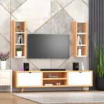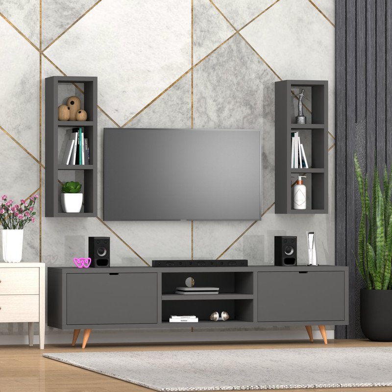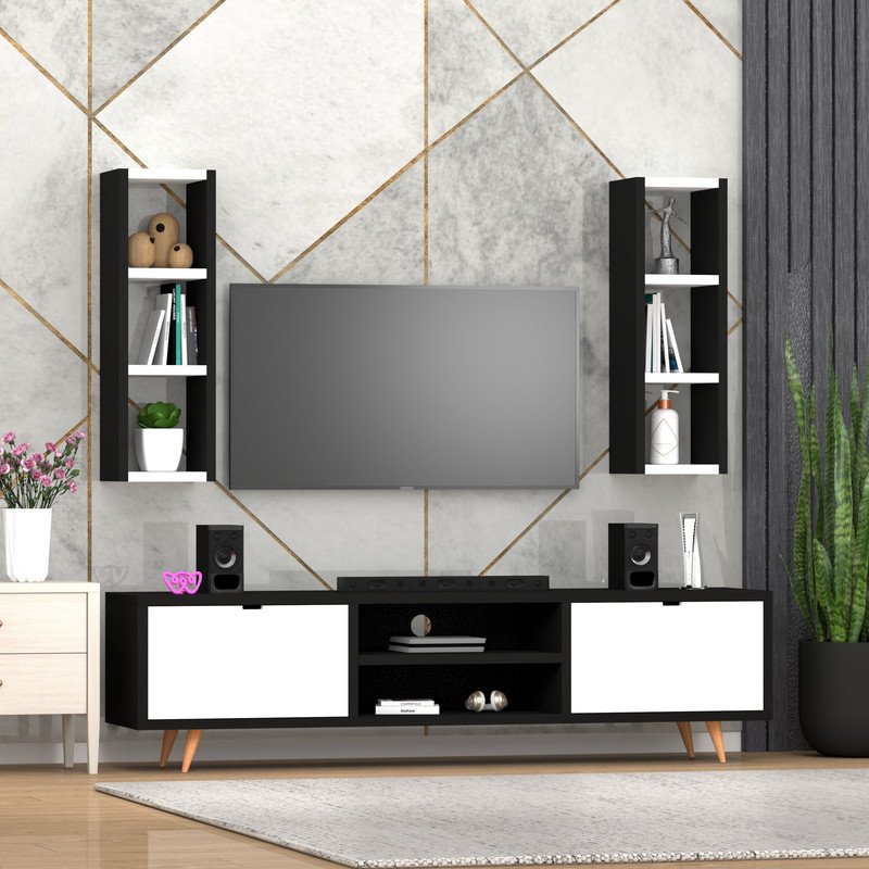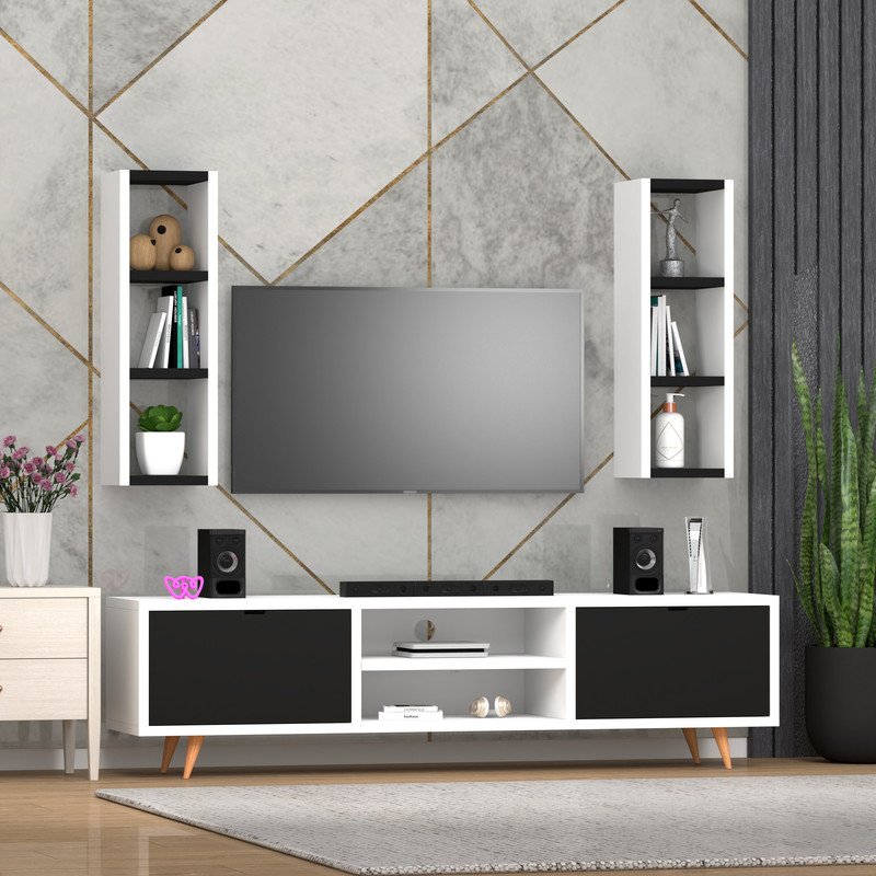 📺 Maximized Vertical and Horizontal Storage – Features dual vertical wall-mounted shelves with three open compartments each for books, plants, or collectibles, plus a TV console with center shelves for media devices and side cabinets to keep clutter hidden yet accessible.