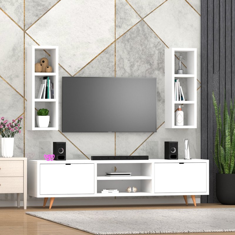📺 Stylish All-in-One Entertainment Center – This modern white media console set includes a wall-mounted TV unit, two floating display shelves, and a spacious base cabinet with both open and concealed storage, offering the perfect blend of function and minimalist elegance to elevate your living room décor.